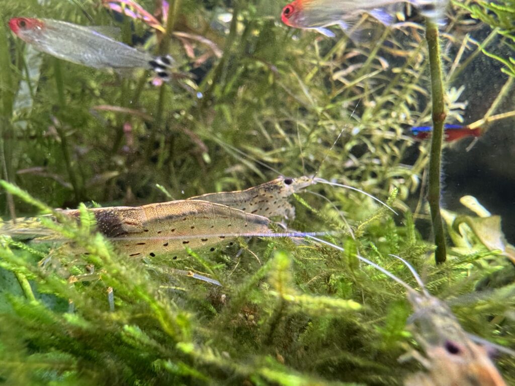 流木、水草、モス、石組みなど、身を寄せられる場所があると落ち着きやすくなります。今回の写真でも、水草の間や流木の上にいる姿が多く見られますが、こうした構造物があるとヤマトヌマエビの自然な行動が見やすくなります。