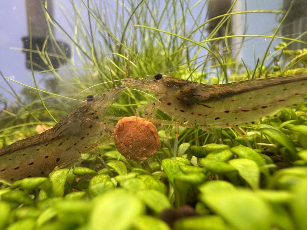 また、普段はコケや微細な有機物を食べていますが、人工飼料にもよく反応します。食べるときの集中力が高く、餌の場所に素早く集まり、前脚と口元を使って器用に食べ進めます。写真一枚目のようなシーンは、飼育者にとってかなり満足感が高い場面です。